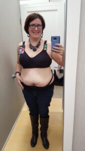I spent way too much time there. First I looked at shapewear. I hate how my belly looks right now because it sticks out in really weird ways. I wanted to find something to just smooth things out a little. That was hard because most shapewear I can’t pull up due to my arm/weight restrictions. They were just too hard! I also looked for a bra, the main reason for the trip. I found a couple that looked like they would be comfortable. They were the same brand, just different cuts. I tried them on and I couldn’t stop smiling. I looked in the mirror and not only was the bra extremely comfortable, but it looked amazing. I looked amazing. Okay, so my belly was hanging out and not quite so amazing, but this was the first bra I’d tried on in a store like Kohls in 10, 15, maybe 20 years. I kid you not. 20 years.